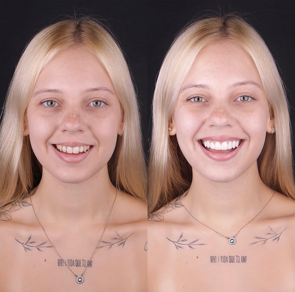 A escolha da cor é feita junto com o paciente, no dia do procedimento. Podemos optar por tons mais naturais ou por um branco mais evidente, sempre respeitando seu desejo e o que harmoniza com seu sorriso.